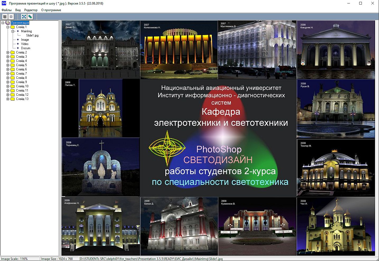Роботи студентів, що представлені у цьому розділі, виконувались, як правило, у рамках дипломних проектів. Основною метою цих робіт було дослідження студентами SOURCE-текстів готових програм та внесення до них доповнень або налаштувань відповідно до поставлених завдань. Враховуючи, що профіль підготовки студентів кафедрою електротехніки та світлотехніки досить далекий від програмування, завдання на доповнення чи налаштування були дуже скромними. Незважаючи на це деякі студенти виконували досить цікаві розширення або модифікації наданих їм програм. За профілем світлотехніки основними завданнями були завдання з обробки зображень. По профілю електротехніки ставилися завдання з розрахунку електричних ланцюгів чи спектрального аналізу електричних сигналів. Нижче наведено теми робіт та образи екранів програм, які досліджувалися та доопрацьовувалися студентами. 2009-2013 роки