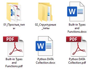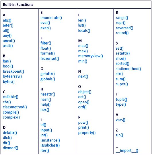 або клас визначаються кодом: Відносно об'єктів, що належать до подібних груп типів або подібних властивостей в типах, Python пропанує вбудовані функції. Нижче представлений перелык таких функцій сортирований за алфавітом: Детальніше про вбудовані функції наведено за посиланнями: |