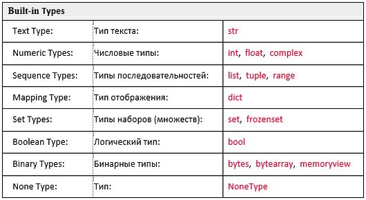 Знайомство с мовами програмування завжди необхідно починати з даних, з якими буде працювати той чи інший інструментарій мови. Це зручно продемострувати на прикладі абстрактної дії "Різати". Зрозуміло що різати можна хліб, деревену, метал, камінь та інше, але також зрозуміло, що в кожному випадку доведеться застосовувати зовсім різний інструмент та спосіб його використання. В системі Python данні це завжди динамічні екземпляри, що створюються відповідно до їх типу як об'єкти. На малюнку, що наведений нижче, червоним кольором наведені вбудовані в Python типи: Детальніше про типи даних наведено за посиланнями: