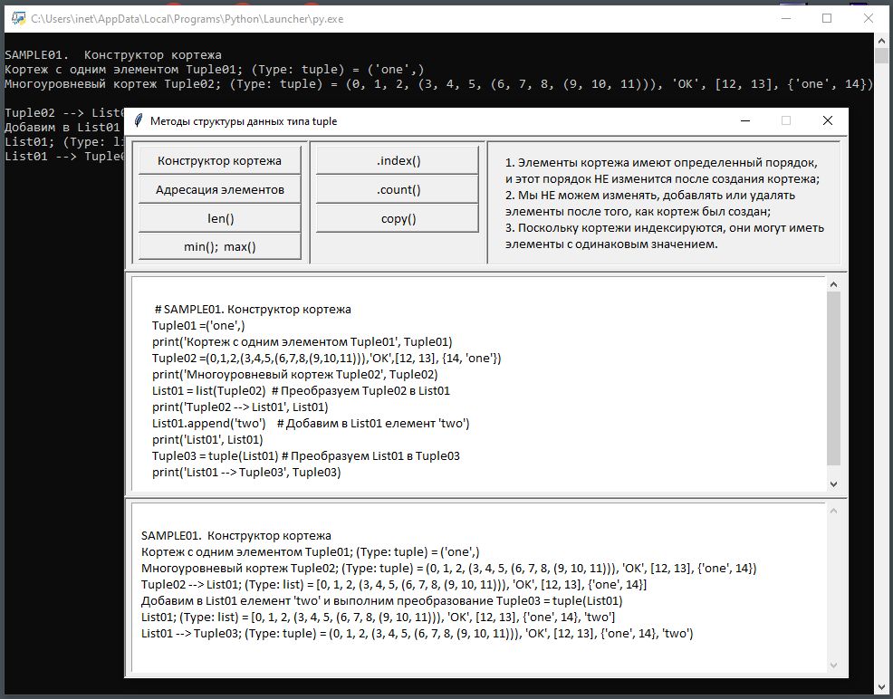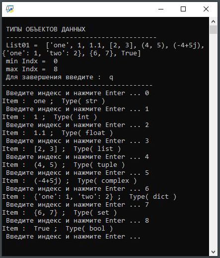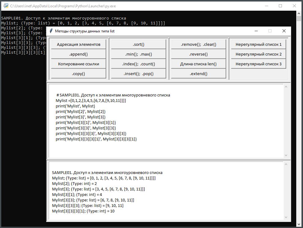 наведених типів можна ознайомитися за посиланням: Додатково наведемо документ по методам типу str, який влючає посилання, що демонструють работу таких методів: Значно частіше в Python застосовуються об'єкти що конструюються програмістом з допомогою типів list, tuple, dict та set. Особливотю об'єктів таких типів є струкура що включає до себе інші об'єкти. Розгянемо конструктори та методи таких конструйованих об'єктів: