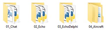 Чотири підрозділа. В підрозділах наведено приклади TCP/IP програм серверов (Python реалізація) та клієнтів (Python та Delphi_7 реалізації). Клієнт - сервверна пара з директорії 04_Aircraft показана на наступній копії екрану: ADD та ADD_DOCUMs Два підрозділа. Поступово в ці підрозділи будуть завантажуватися нові поповнення. На поточний час дуже рекомендую розібратися с двома документами з підрозділа ADD_DOCUMs: |